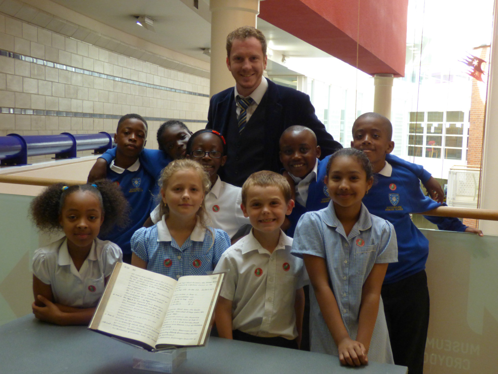 LOOKING BACK: Children from Ecclebourne Primary School and music teacher Tim Sporerer with a log book from when pupils were evacuated from the school’s former buildings to make way for a war hospital. The book is on display at Croydon Museum”